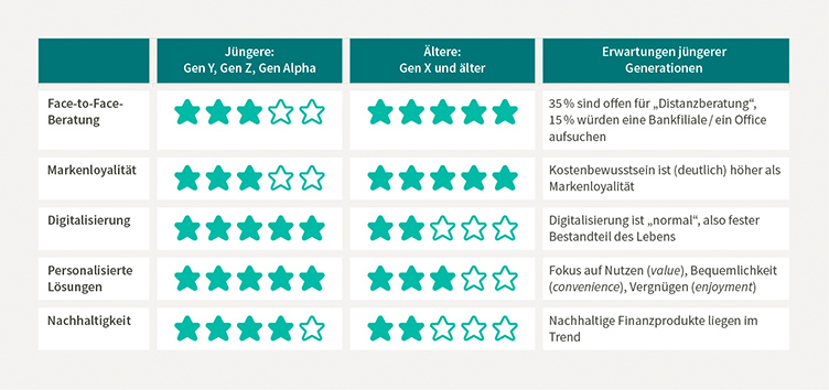 | Einstellung zu Geld, Vermögen und Altersvorsorge | • Finanzthemen früh präsent durch Apps und Neobroker • Experimentierfreudig, hohe Risikobereitschaft • Trading-orientiert • Wachsendes Interesse an Eigenverantwortung, Wunsch nach Kontrolle |
